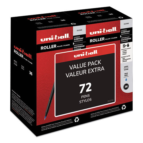 UNIBALL Stick Roller Ball Pen, Micro 0.5mm, Blue Ink, Black Barrel, 72-pack