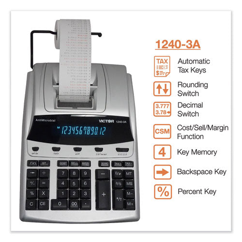 Victor® 12-digit heavy duty commercial printing calculator. Features a contemporary silver and black styling. Engineered with an antimicrobial agent to reduce the growth of microbes and bacteria on the product that can cause discoloration and odors. Manufactured with recycled plastic. Large fluorescent display. Fast 4.3 lines-per-second 2-color printer. Features include: automatic tax keys, markup/gross profit margin, grand total, delta percent, item count, and backspace key. Power Source(s): AC; Display Notation: Numeric; Number of Display Digits: 12; Memory: 4-Key.