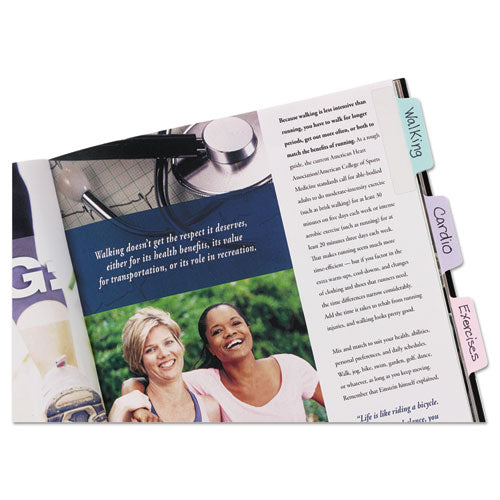 Sturdy, self-adhesive repositionable tabs that make indexing, marking, referencing and separating documents quick and easy. Writable on both sides of the tab, and the adhesive body is clear so you can see text underneath. Durable enough to turn pages like a divider, and they stick securely but remove cleanly with no residue. Ideal to use for organizing and marking key information in notebooks, files, books, planners and more. Perfect for home, office and school. 2 1/2 x 1 Margin Tabs€”Long, slim-body tabs fit on the margin of a page without obscuring text. File Insert/Tab Type: All-Purpose Tabs; Tab Cut: 1/5-Cut; Color(s): Assorted Pastel; Color Family: Multicolor.