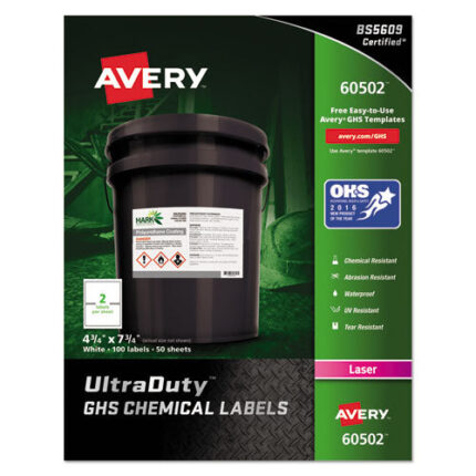 Waterproof and resistant to chemicals, abrasion, sun, tearing, and harsh temperatures. High-performance adhesive. Ideal for labeling drums, totes, pails, jugs and bottles. For Laser Printers€”Easy Peel® for fast peeling. Letter-sized, 8.5 x 11 sheets. Shape: Rectangular; Label Size – text: 3.5 x 5; Label Color(s): White; Color Family: White.
