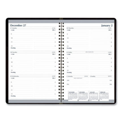 Full-week view on each one-page spread with open-schedule ruling to accommodate a flexible appointment scheduling. Columnar format provides one column per weekday and one combined column for Saturday and Sunday. Future-planning section for the following year, a memo section and a name/address section, a three-year reference calendar page for long-range planning and an important holiday date list spanning three years. Made entirely of recycled materials. Size: 8.75 x 6.88; Page Color/Theme: White/Blue; Appointment Ruling: Open Scheduling; Edition Year: 2021.