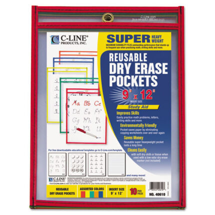 Reusable Dry Erase Pockets, 9 X 12, Assorted Primary Colors, 10-pack