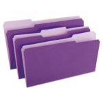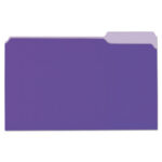 Bright color€”great for color-coding and preventing misfiles. Constructed of high-quality 11 pt. stock to resist tearing. Bottom is triple-scored for 3/4″, no-sag expansion. Undercut at tabs. File Folder Size Type: Legal; File Folder Color: Violet/Light Violet; Color Family: Purple; File Folder Material: 11-pt Stock.